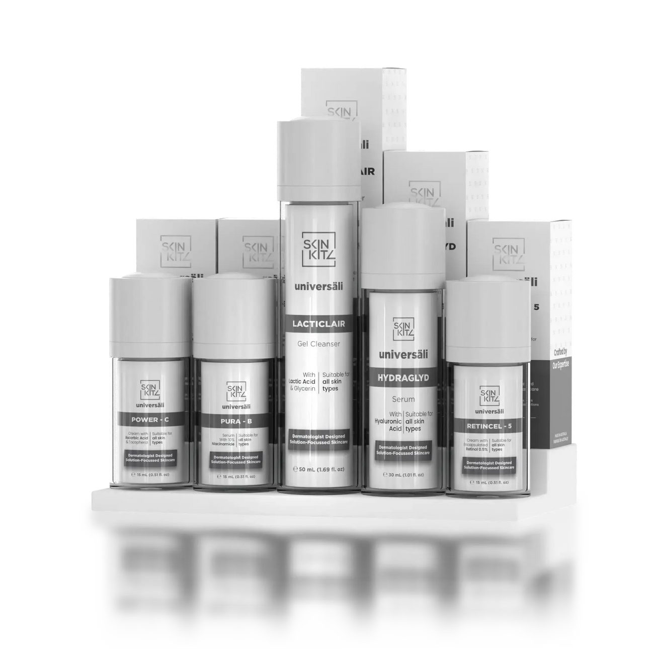Universäli Kit includes 5 products: Universäli Lacticlair Gel Cleanser, Universäli Power-C Cream, Universäli Pura-B Serum, Universäli Retincel-5 Cream and Universäli Hydraglyd Serum.